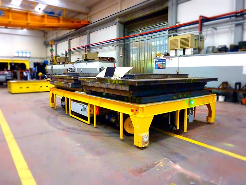 OMNI permite reducir al mínimo el uso de grúas y puentes grúa, gracias a la plataforma de carga elevable que permite a estos carros autopropulsados multidireccionales elevar la carga y transportarla hasta donde sea necesario.